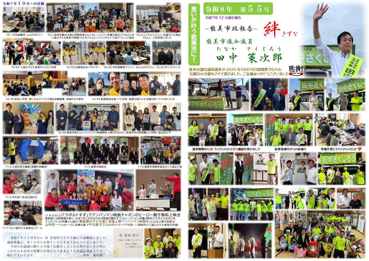 市民の皆様の声を大切にし、住みよいまちづくりを進めています!2025年10月「絆」54号発刊しました! クリックすると拡大します 議会質問で実現した52事業を一覧にまとめました「絆」36号